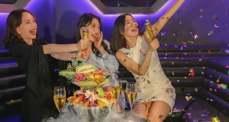 どちらのお時間も沢山の人で賑わっておりますが、バーラウンジのようにゆっくり会話されたいお客様や女子会、誕生日会などのご利用は、24時までのお早めのお時間もオススメです。より満員のフロアと派手なナイトアウトをお楽しみいただくには1時以降の熱気は格別です!