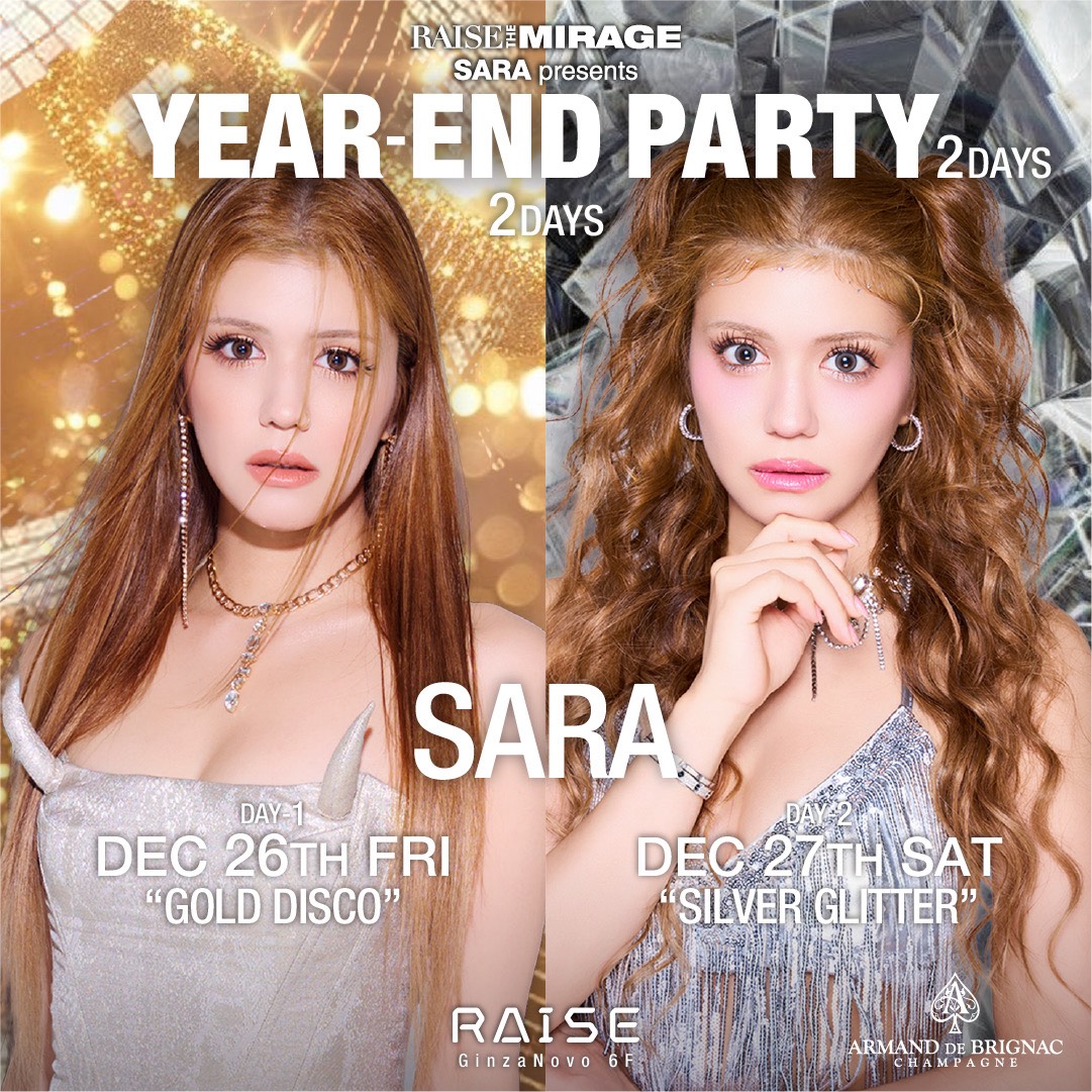 モデル・タレント・アーティストとして活躍するSARAがプロデュースする、RAISE年末恒例の人気イベント“YEAR-END PARTY”が、今年は12/26(金)–27(土)の2DAYSで開催されます。初日は華やかな“GOLD DISCO”、二日目は幻想的な“SILVER GLITTER”と、両日で異なる世界観を展開。テーマカラーを身に着けた女性には特典も用意され、パーティー気分をより一層高める仕掛けが揃います。街がきらめく年の瀬、銀座で過ごすラグジュアリーなひとときを二夜続けて堪能できる特別な2DAYS。年末の締めくくりにふさわしい華やかなパーティータイムを、ぜひお楽しみください。